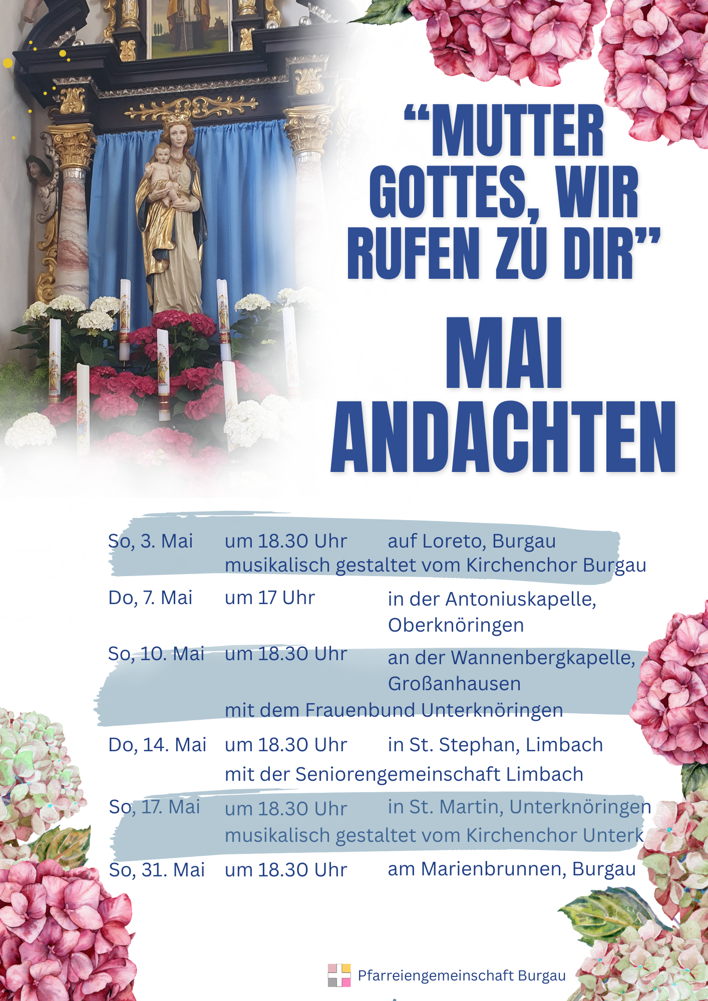 Wir feiern am 26.4. in Unterknöringen, am 10.5. in Limbach und am 17.5. in Burgau.